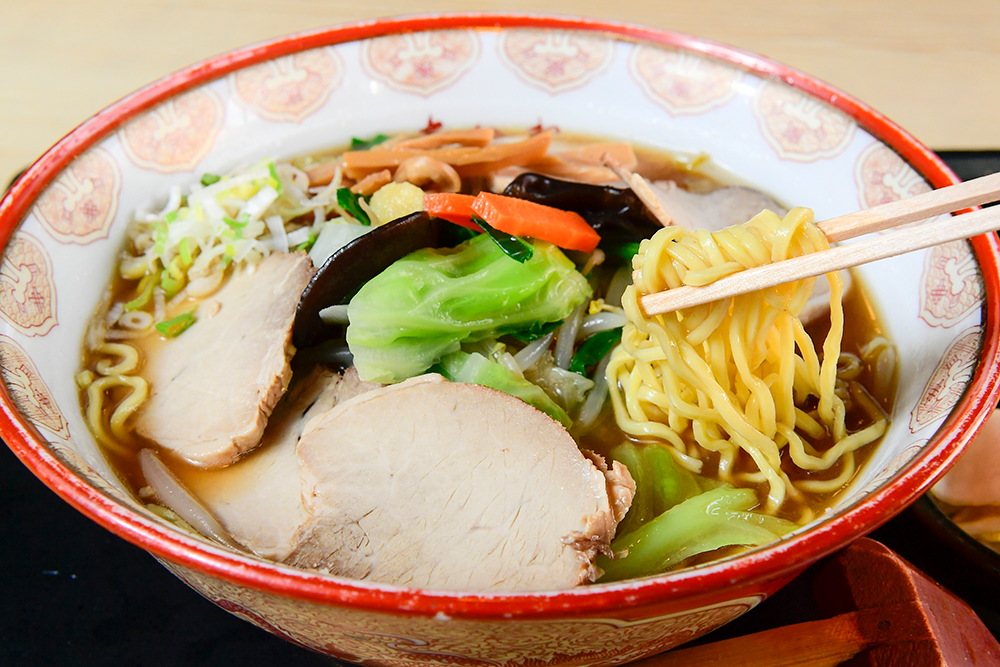 蕎麦屋で作る自家製麺はコシが強くスープによく馴染みます。煮干しがたっぷり入ったスープに中太ストレート麺・自家製チャーシューでつくっており、隠し味にハチミツが入っています。野菜たっぷり栄養満点!