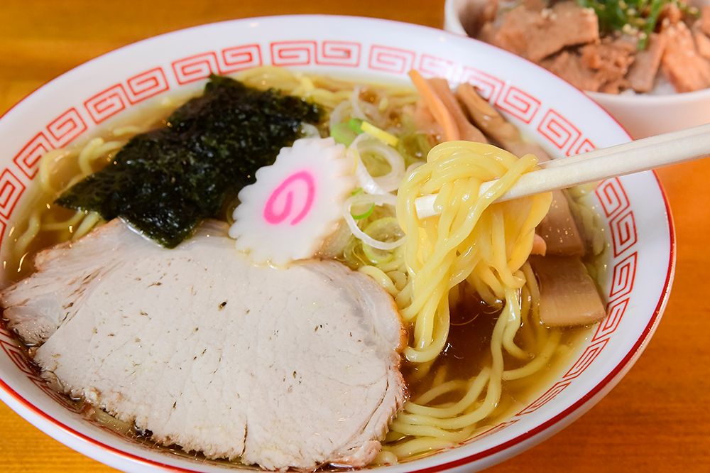 鶏ガラベースで優しいスープの昔懐かしい中華そばと夜の焼鳥用タレで絡めたチャーシュー丼のセットです。