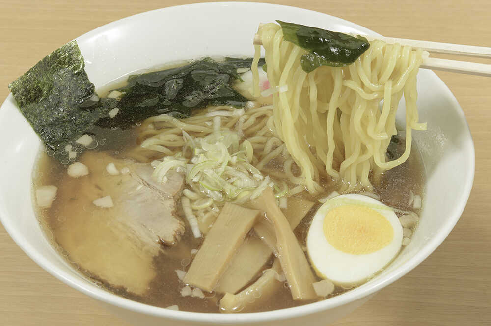 あっさりした醤油スープ、スープに絡むちぢれ麵、具材も豊富に。