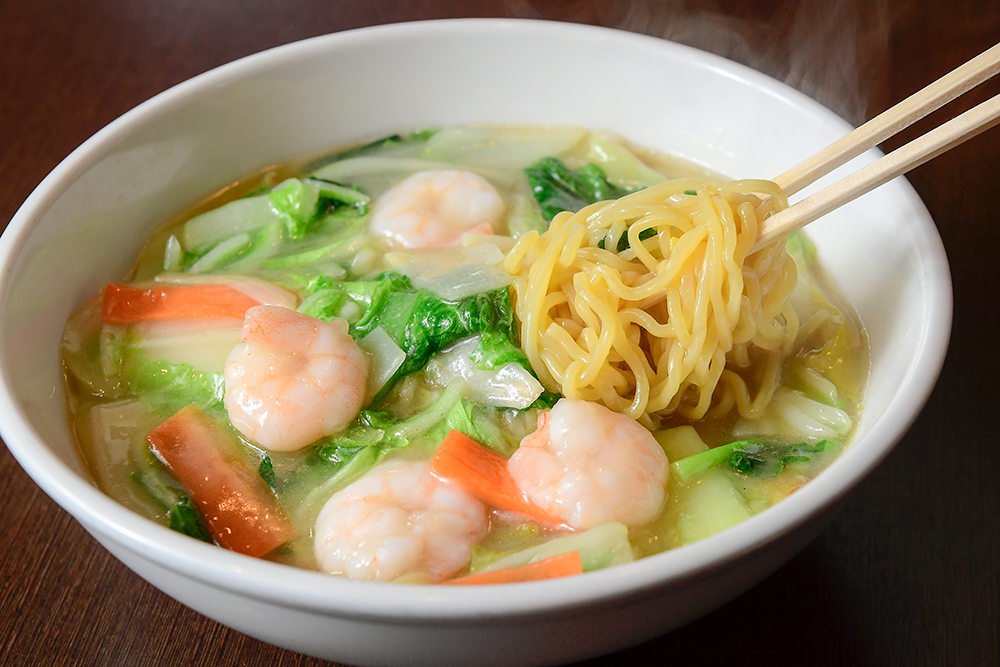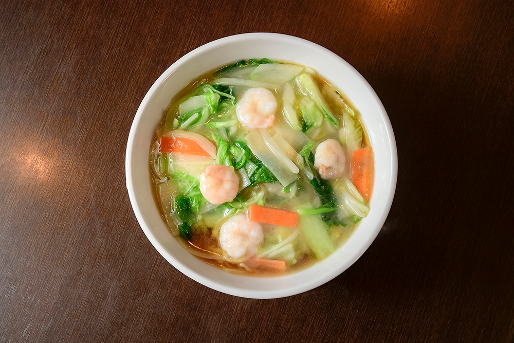 鯖ダシのスープに、海老と野菜を煮込んだあんかけの具をのせたラーメン。海老と野菜の甘みあるあんが麺によく絡み、身体が温まる一杯です。