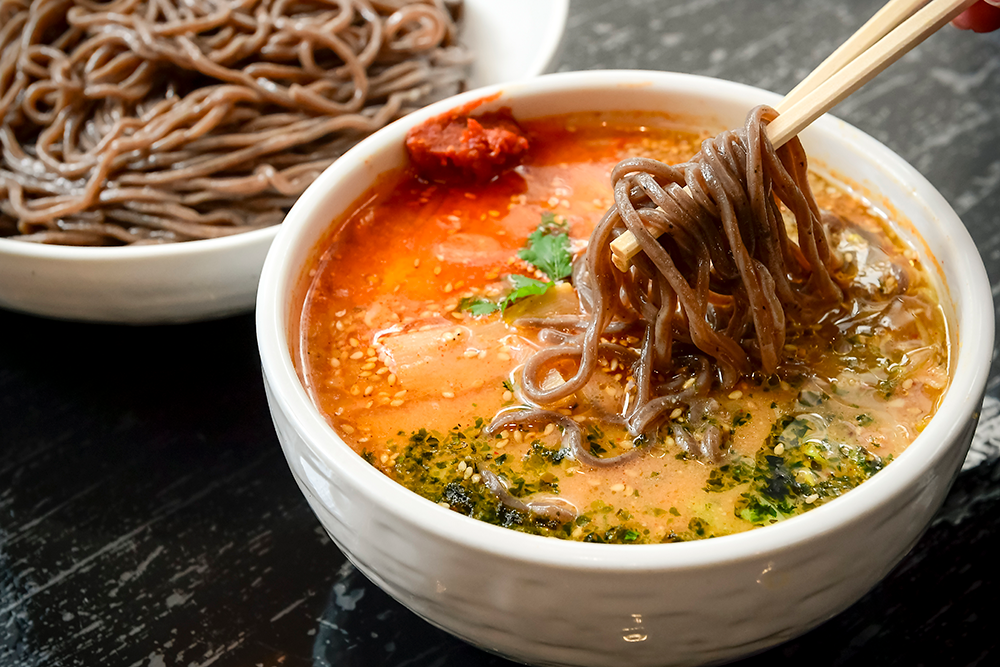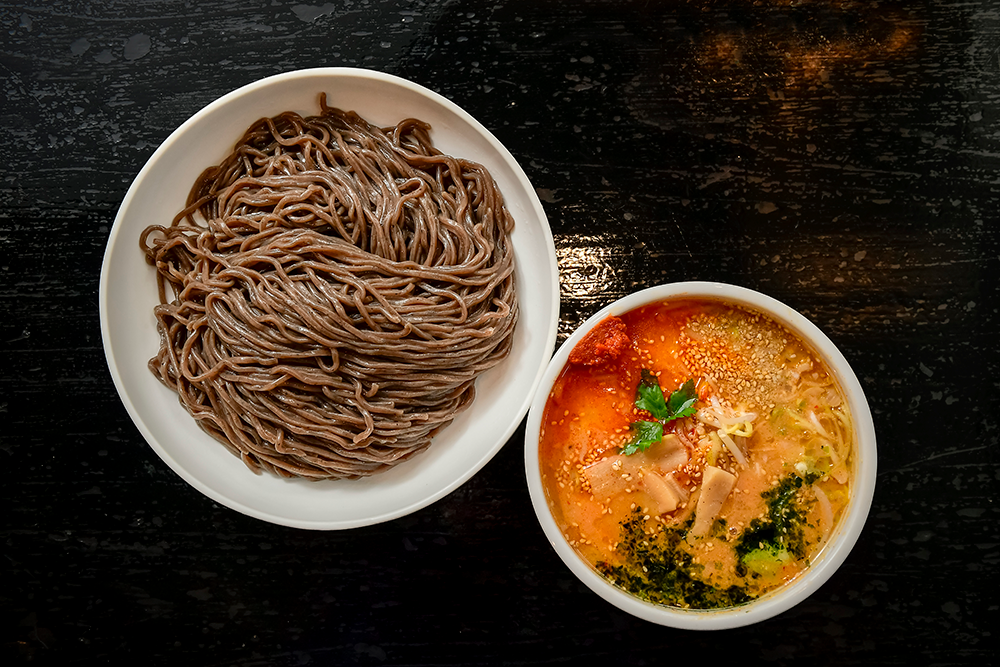 愛媛・長崎産煮干しの旨みだけを抽出したスープに、2種の味噌をブレンドしたつけ汁。黒小麦麺の香ばしさが際立つ、こだわりの一杯。
