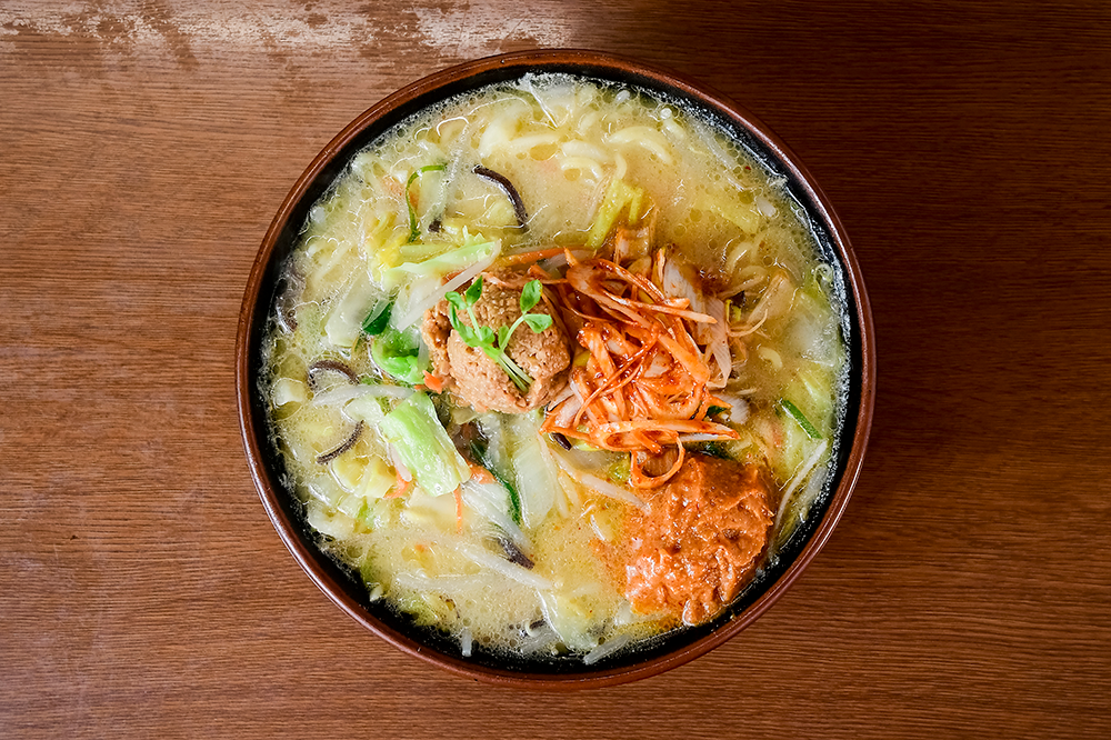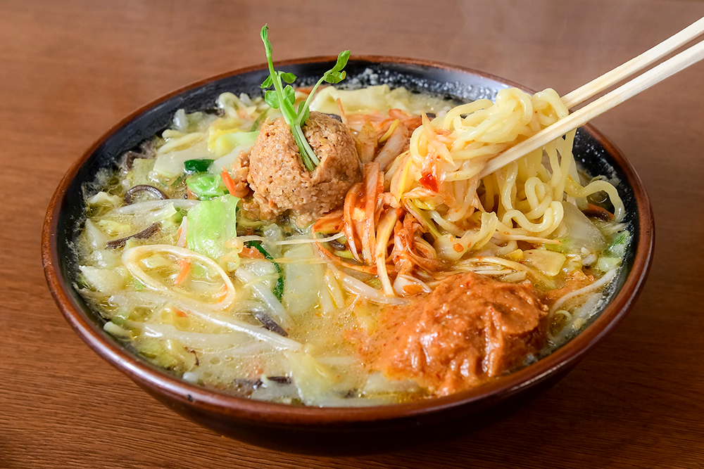 創業25年を迎える人気店。味噌ラーメンの中でも一番のおすすめがこの「なっとう味噌 辛ネギ」。野菜たっぷりで、仕込み味噌との相性バツグン。納豆は刻み包丁を入れているのでまろやか。