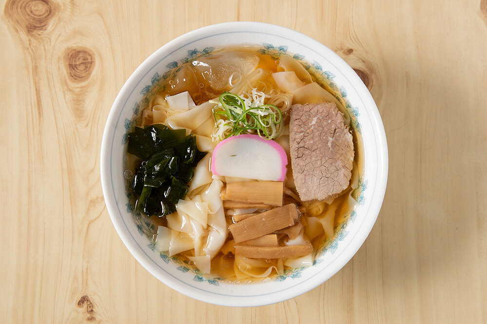 つるっとした食感のワンタン、醤油スープに鰹ダシがきいた一杯。一年中食べることのできる冷しでどうぞ!