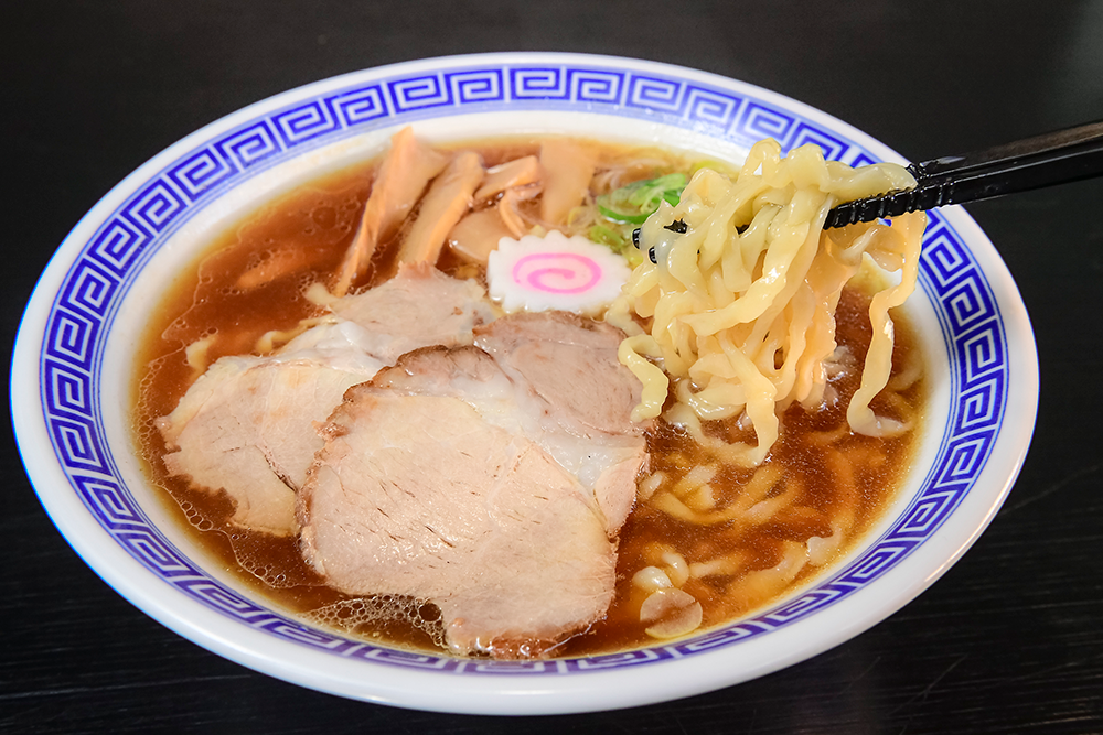 鶏ガラ、豚ガラ、煮干しを数時間炊いて旨みを抽出した動物系・魚介系のWスープ。チャーシューは肩ロースを使用。麺は中太麺に手揉みを加えた中太ちぢれ麺でスープとの相性も抜群です。