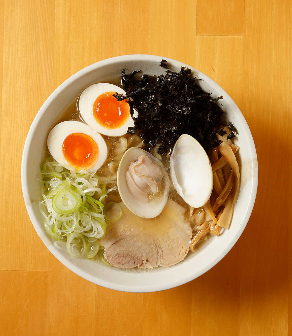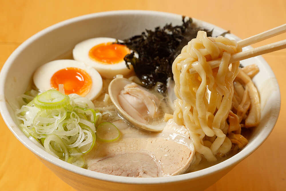 はまぐりとホタテの旨みが凝縮した貝ダシに、動物系のコクを合わせたWスープが自慢です。噛むほどに小麦の風味が広がる太縮れ麺は全粒粉入り。手もみを加えてから3日間寝かせることで、ツルプリ食感に!