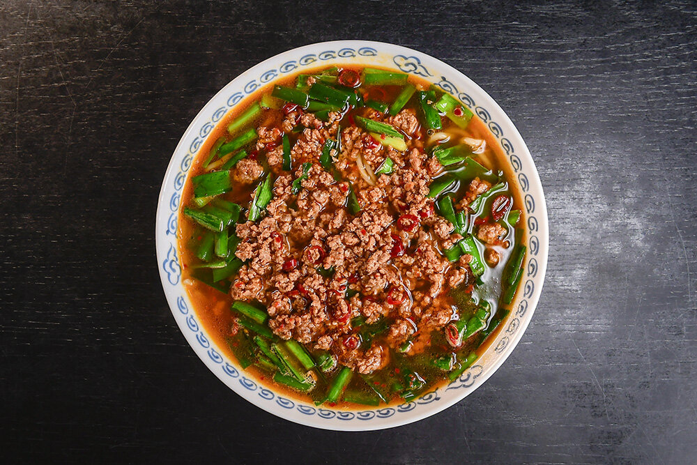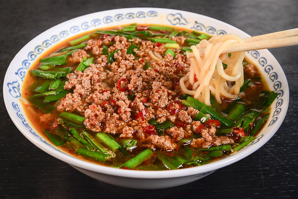 鶏ガラのスープの麺にたっぷりの豚ミンチとニラ、そして唐辛子。辛いのに箸が止まらない一品で、病みつきになること間違いなしです!