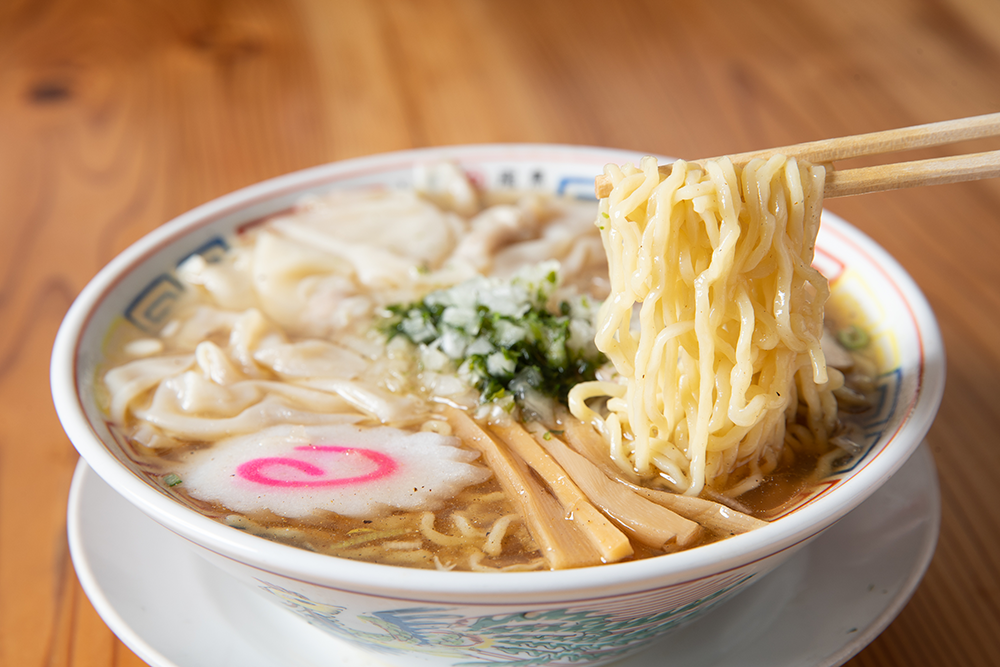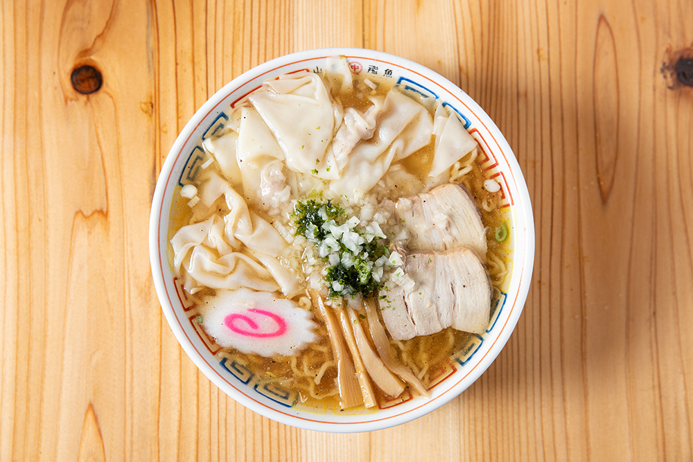 獲れたてのアゴ(飛魚)を一度焼いてから天日干しにした「焼きアゴ干し」を贅沢に使用した芳醇な味わいの出汁をベースにした自慢の「中華そば」に、ふわとろの「手作りワンタン」がよくあいます。