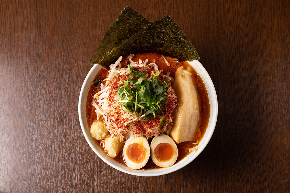 動物系のダシは抑えめに、米やバナナといった素材でコクをUP。魚介ダシと辛味噌を合わせ、がっつり濃厚かつ胃もたれしない味わに仕上げた一杯。辛さは小・中・大、さらに激辛、MAXまでお好みで選べます。