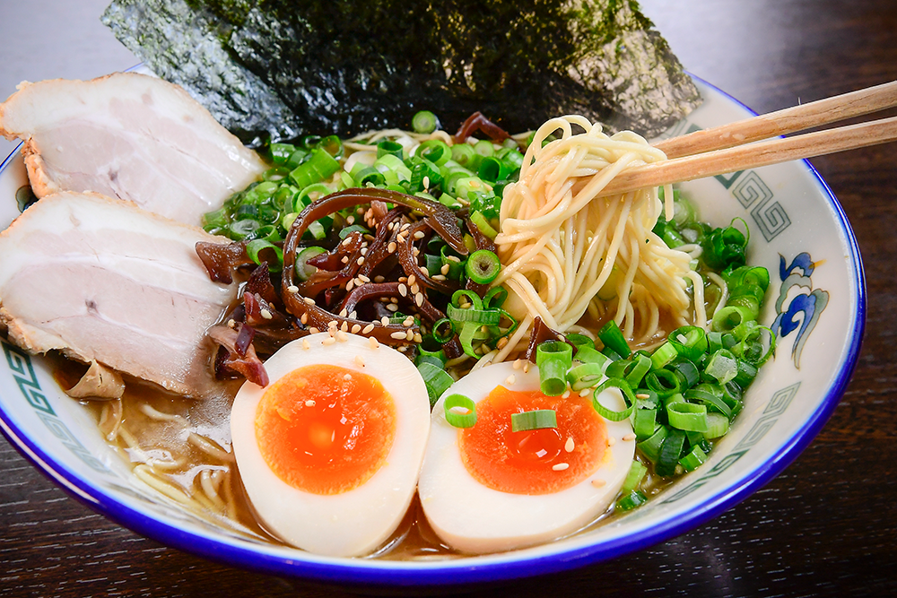 深みとコクのあるスープと細麺との相性抜群!こだわりのチャーシューは、柔らかく口の中でとろけますよ。定番の紅しょうがや辛子高菜・ニンニクをはじめ、自家農園の野菜や漬物がサービスなのもうれしいですね。
