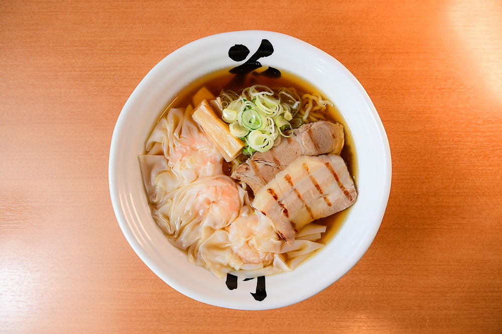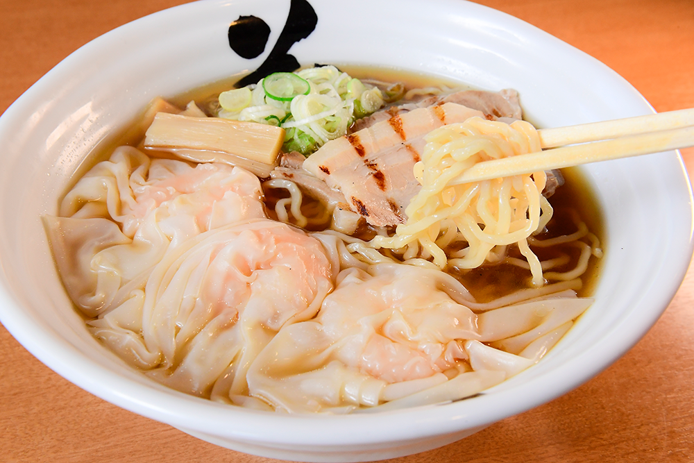 自家製の熟成多加水麺(ちぢれ細麺)と魚介出汁がベースの上品なスープ。ワンタンの皮はとても薄く「つるっ」「ふわっ」としたのどごしが特徴。
