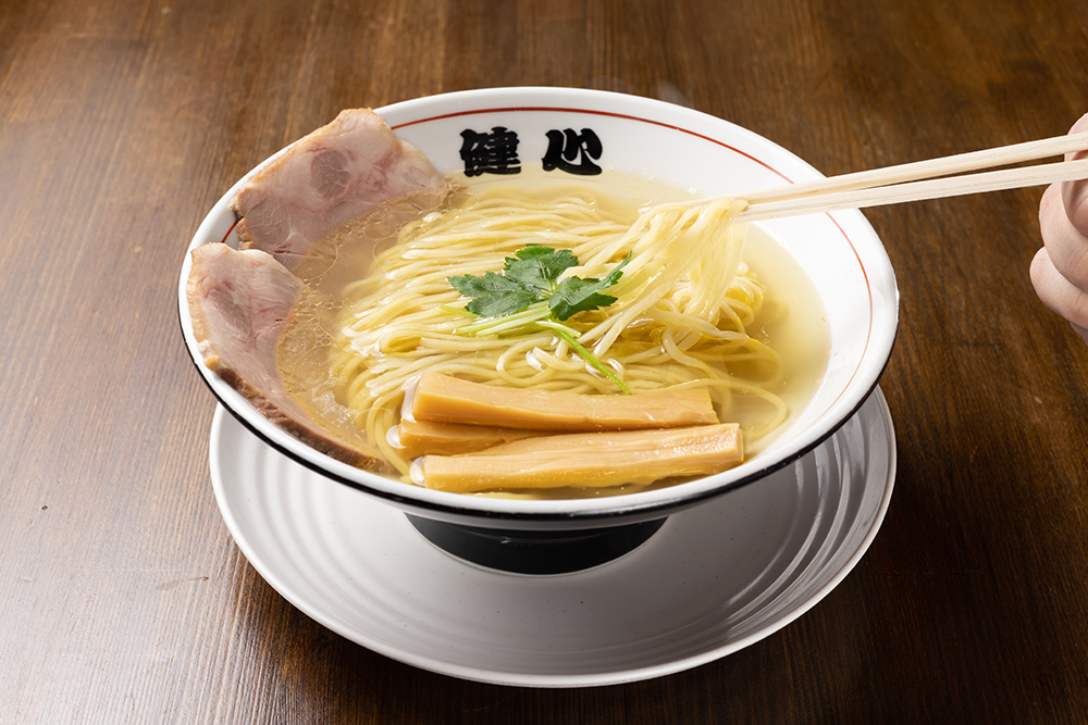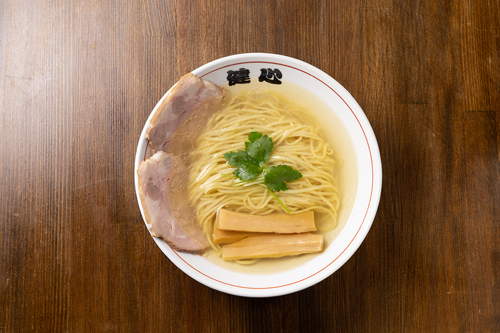 クリアな鶏スープにヒマラヤ岩塩をあわせたシンプルなスープと自家製細ストレート麺。