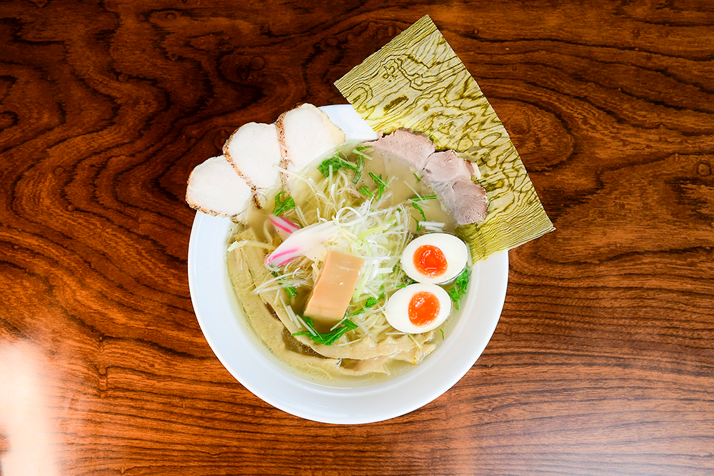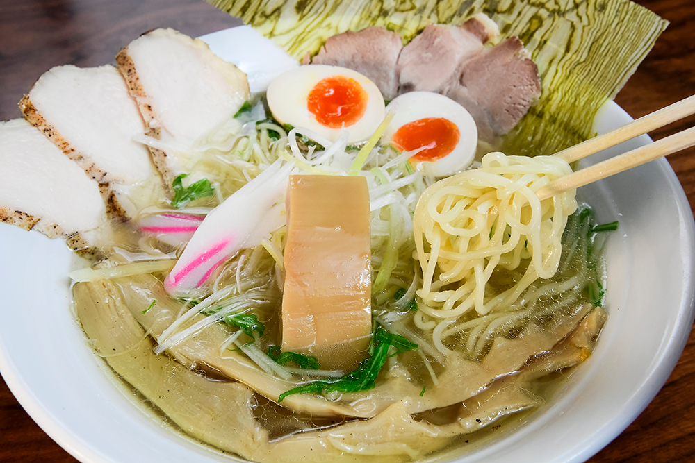 麺は細打ちストレート。丁寧に仕込んだスープに穂先&短冊メンマなど、こだわりの具材を合わせた、鶏が香る淡麗系塩ラーメン。