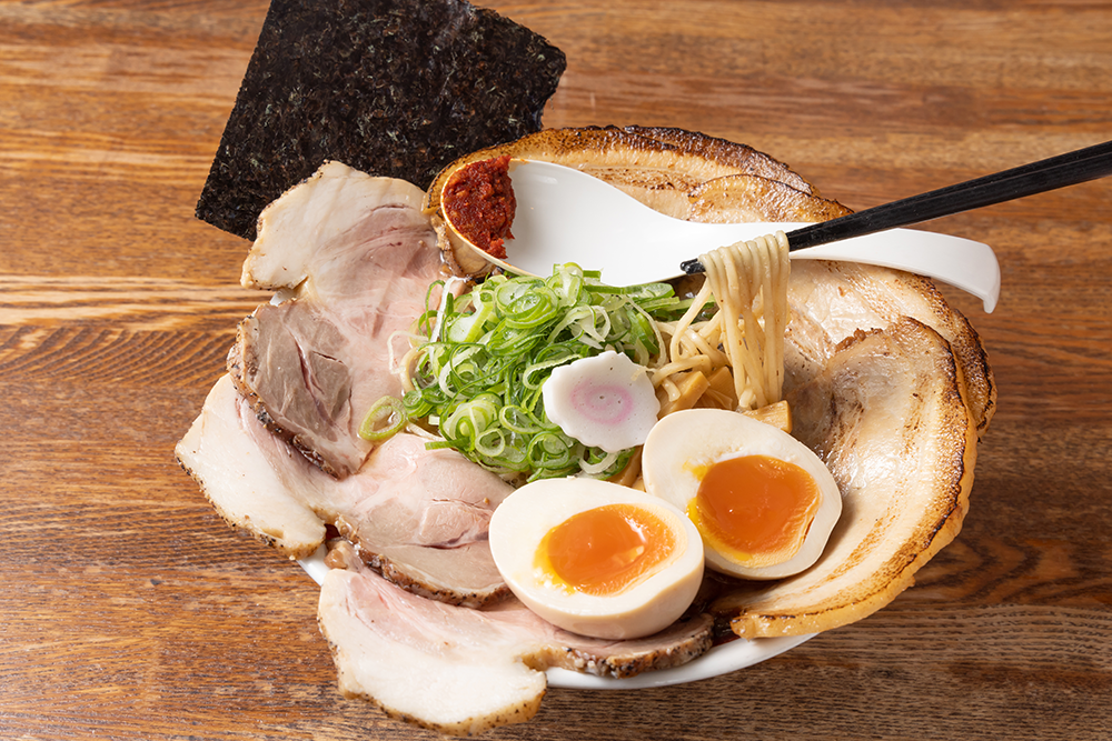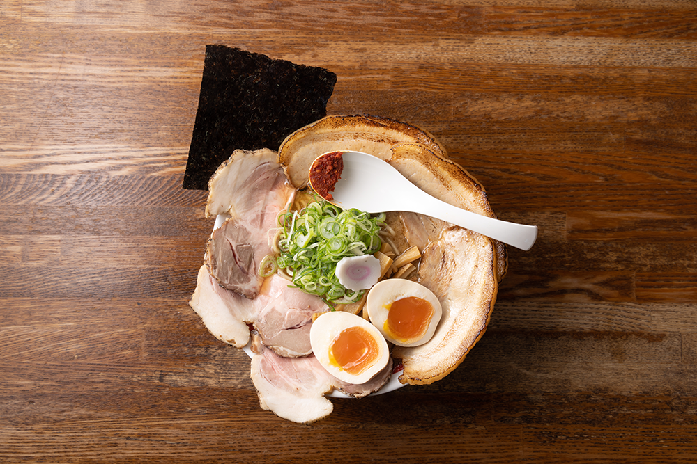 豚骨と煮干しの旨みが凝縮したこってりスープと、北海道小麦を使用した風味豊かなモチモチの自家製麺が最強のマッチング!濃厚なのに後味が軽やかな、なんともクセになる一杯です。